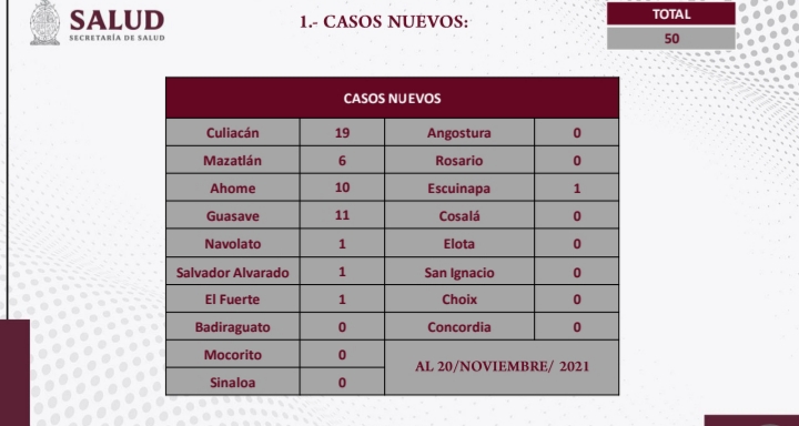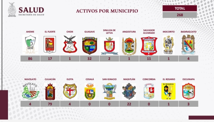 Los municipios con más casos activos son Guasave 32, Culiacán 79 y Ahome pasó de 60 a 86, mientras que las regiones con ningún caso son Cosalá, San Ignacio, Concordia.