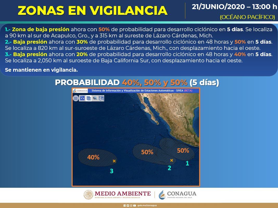 El tercero es una zona de baja presión con 20 por ciento de potencial desarrollo ciclónico en 48 horas y 40 por ciento en 5 días. Se localiza a 2 mil 50 kilómetros al suroeste de Baja California Sur con desplazamiento hacia el oeste.