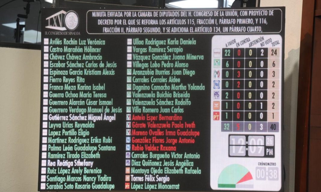 CULIACÁN, Sin.- El Congreso del Estado de Sinaloa aprobó este jueves por mayoría, minuta enviada por la Cámara Federal de Diputados que contiene Decreto que reforma los artículos constitucionales 115, 116 y 134, derivado de una iniciativa de la presidenta Claudia Sheinbaum Pardo.