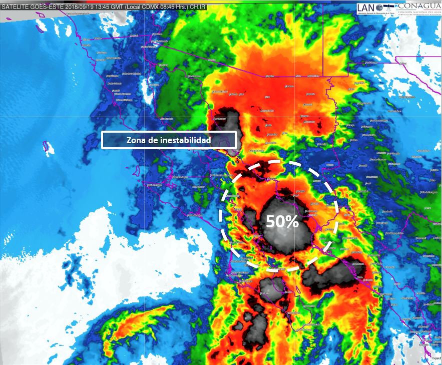 LA PAZ, BCS.- La zona de inestabilidad incrementó a 50% su potencial para desarrollo ciclónico en las próximas 48 horas, su centro se localiza sobre el Golfo de California.