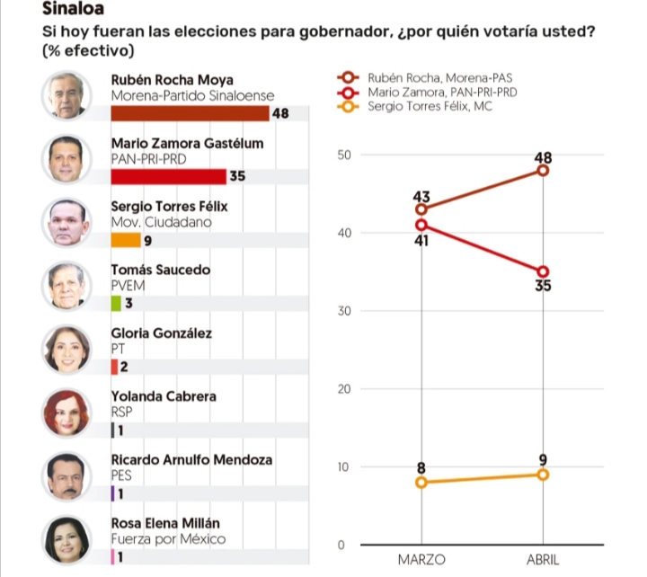 CIUDAD DE MÉXICO.- Rubén Rocha Moya, candidato de Morena al Gobierno de Sinaloa, tomó una ventaja de 13 puntos frente a Mario Zamora Gastélum, abanderado de la alianza de los partidos Acción Nacional (PAN), Revolucionario Institucional (PRI) y Revolución Democrática (PRD), de acuerdo con la más reciente encuesta de El Financiero publicada este martes.