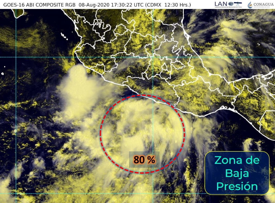 CIUDAD DE MÉXICO.- Zona de baja presión aumenta a 80% su probabilidad de desarrollo ciclónico. Se localiza al sur de las costas de Guerrero, su circulación favorecerá lluvias intensas sobre los estados del sur de México.