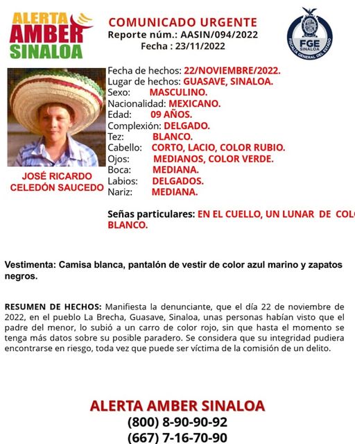 CULIACÁN, Sin.- La Fiscalía General del Estado emitió una alerta Amber para localizar a José Ricardo Celedón Saucedo de 9 años de edad, quien presumiblemente había sido sustraído por su padre.
