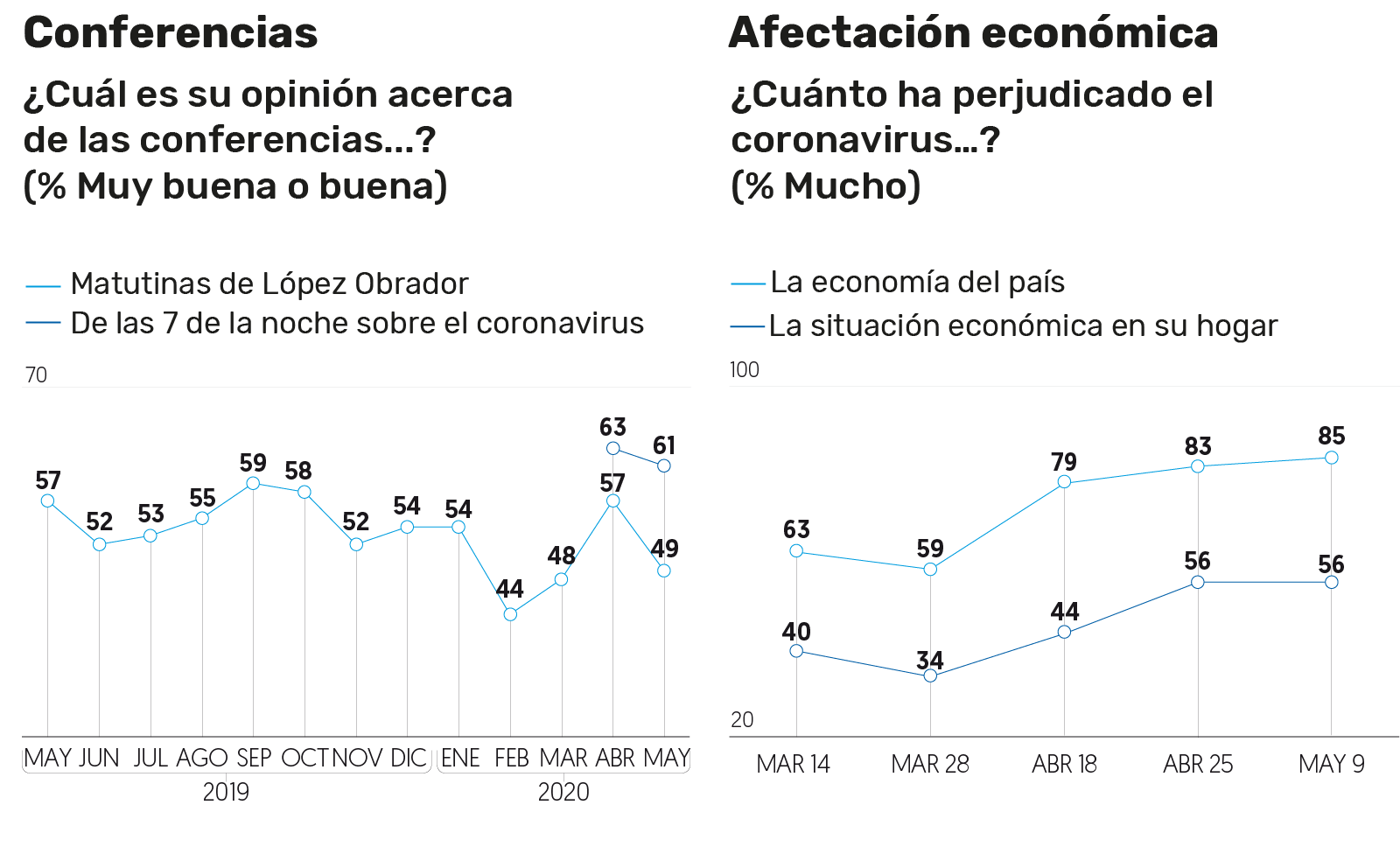 Según el estudio, el 85 por ciento de los entrevistados opinó en este mes de mayo que el coronavirus ha perjudicado mucho a la economía del país, y el 56 por ciento señaló que éste ha perjudicado mucho la situación económica en su hogar. A finales de marzo, esas opiniones representaban 59 y 34 por ciento, respectivamente. El sentido de malestar económico va al alza.