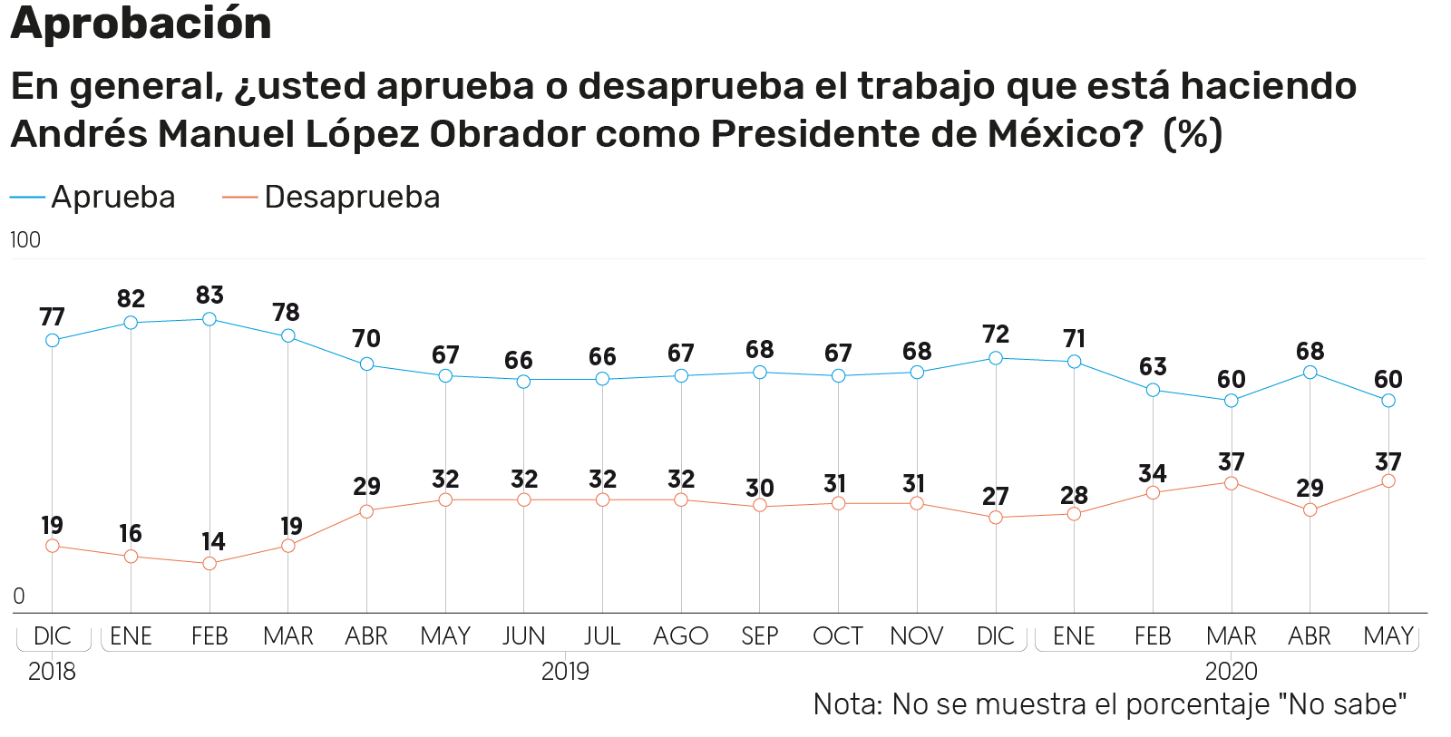 CIUDAD DE MÉXICO.- El nivel de aprobación al presidente López Obrador bajó ocho puntos en el mes de mayo, para situarse en 60 por ciento, según revela la más reciente encuesta nacional de El Financiero.