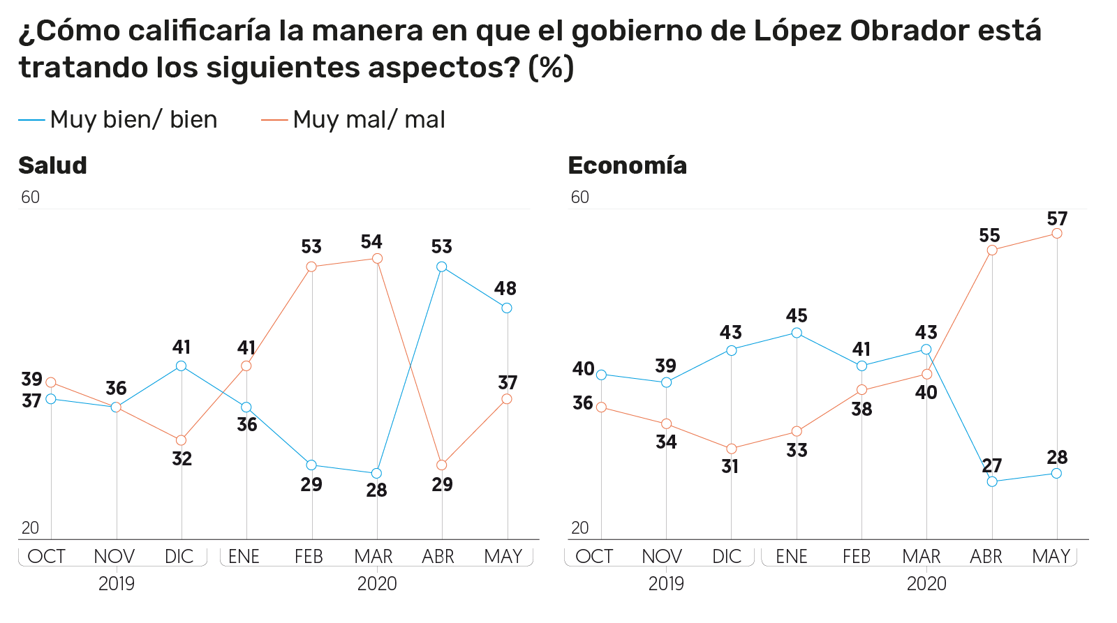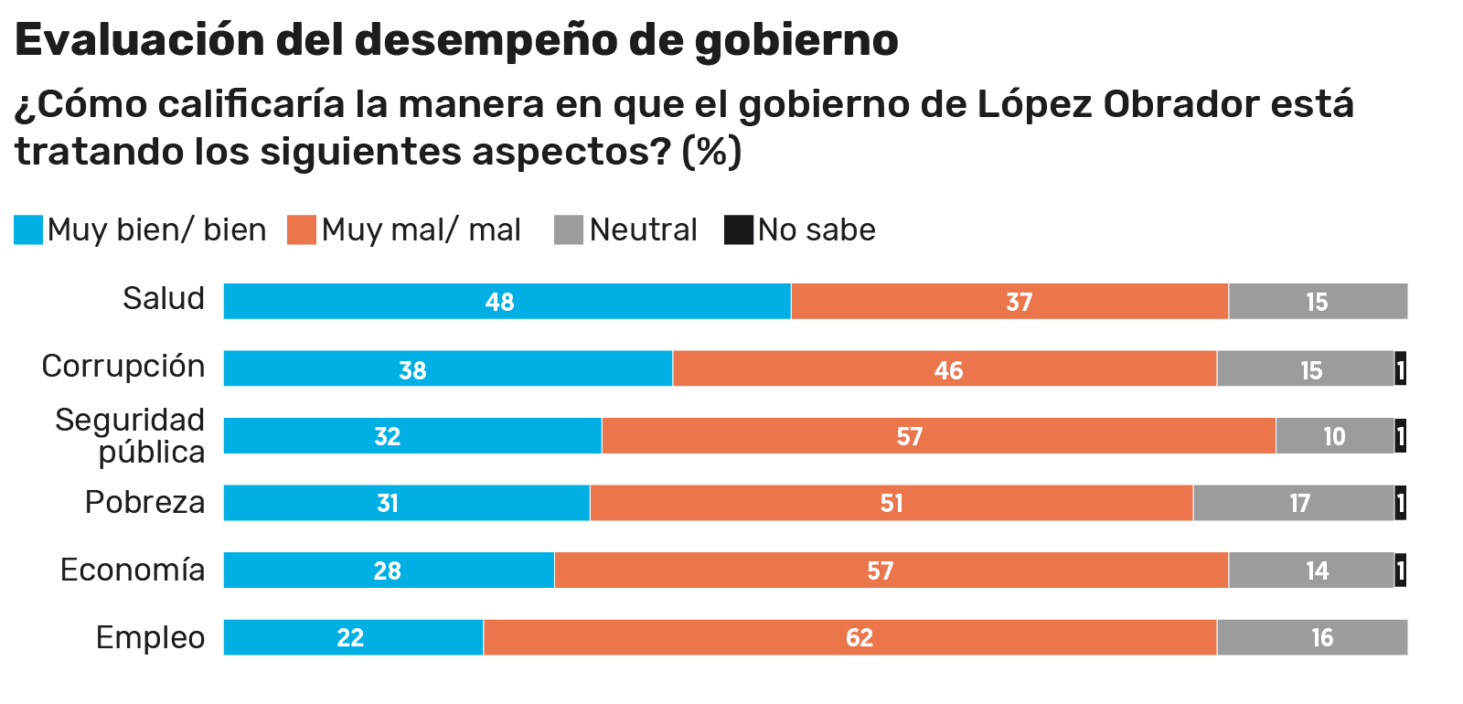 Según la encuesta, el 48 por ciento opina favorablemente de la manera en que el gobierno está tratando el aspecto de la salud, frente a 37 por ciento que opina desfavorablemente. En contraste, el desempeño en economía y empleo son evaluados de manera mucho más negativa: 28 y 22 por ciento opinan favorablemente del desempeño en esos rubros, respectivamente, mientras que 57 y 62 por ciento opina desfavorablemente.