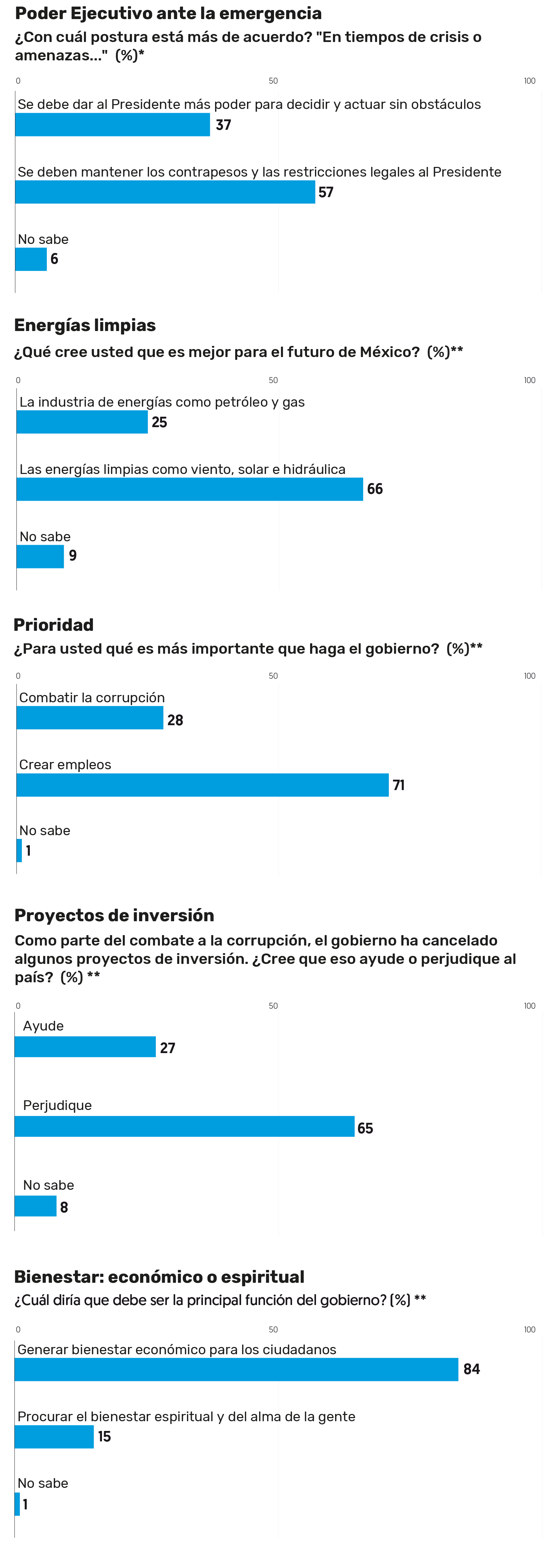 En la encuesta de El Financiero se incluyeron algunas preguntas para contrastar las opiniones de los ciudadanos con respecto a las políticas e intenciones de gobierno. Según los resultados, el 37 por ciento de los entrevistados estaría de acuerdo con dar al Presidente más poder para actuar y decidir en estos tiempos de crisis, mientras que el 57 por ciento, la mayoría, prefiere que se mantengan los contrapesos y restricciones legales al Presidente.