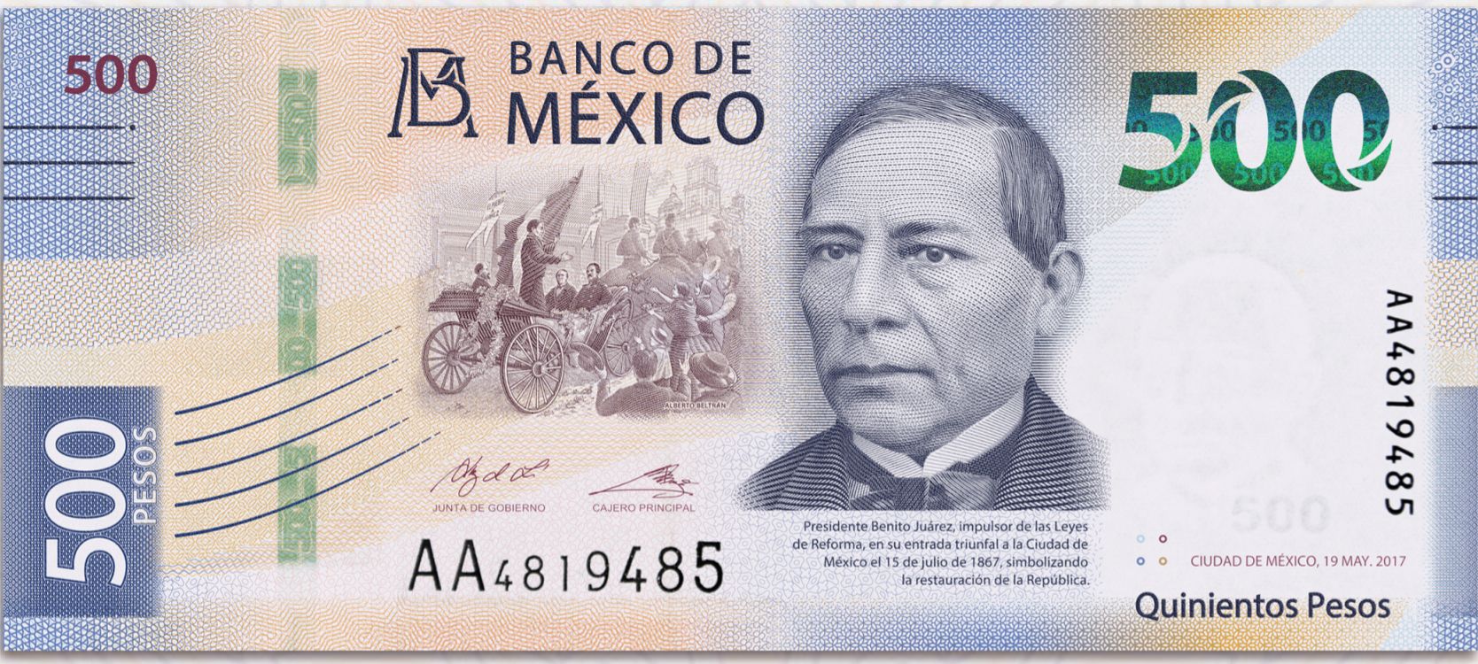 El billete de 500 pesos mexicano, que cuenta con la imagen de Benito Juárez, quedó entre los más bonitos del 2018 en una votación realizada por la Sociedad Internacional de Billetes Bancarios (IBNS)