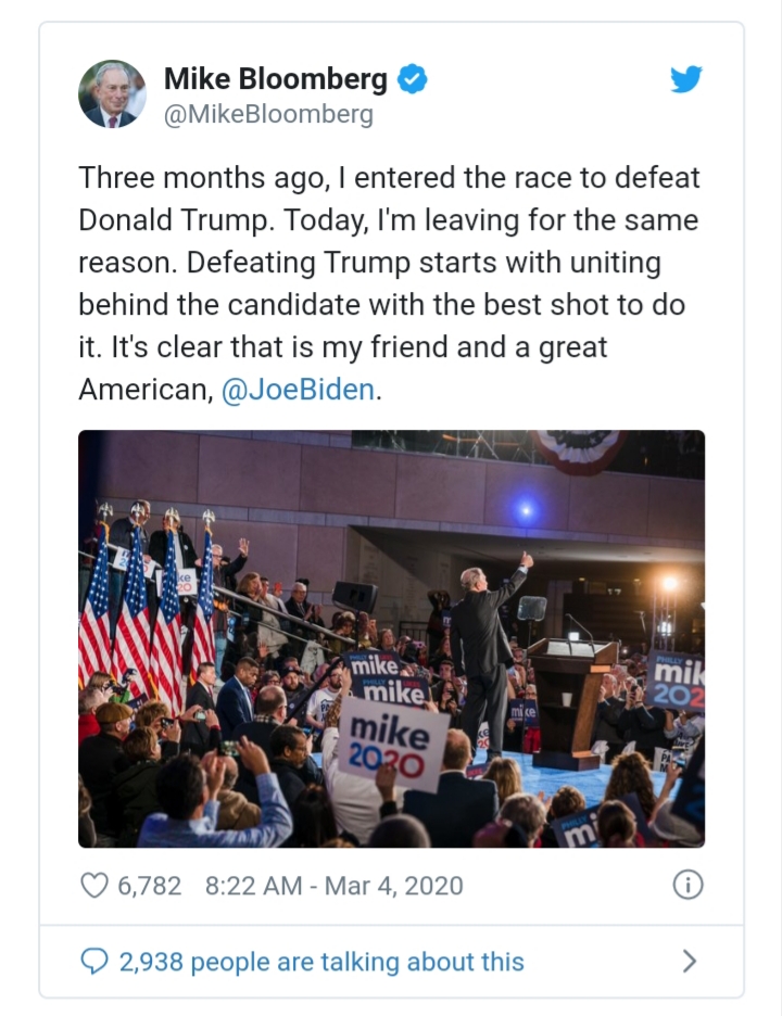 “Siempre he creeido que derrotar a Donald Trump comienza con alinearse detrás del candidato con la mejor chance para lograrlo. Tras la votación de ayer, es claro que el candidato es mi amigo y gran estadounidense Joe Biden”, dijo Bloomberg en un comunicado.