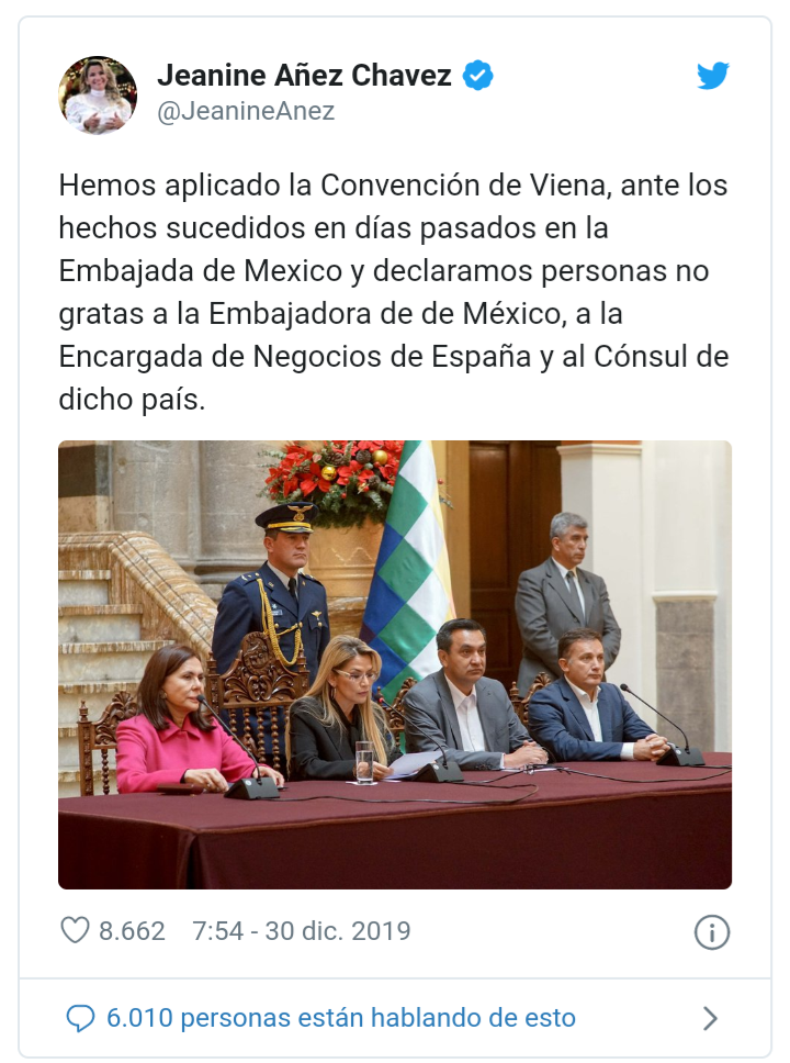CIUDAD DE MÉXICO.- La presidenta interina de Bolivia, Jeanine Áñez, ordenó este lunes la salida del país de la embajadora de México, María Teresa Mercado; así como de la encargada de Negocios y del cónsul de España, Cristina Borreguero y Álvaro Fernández, respectivamente.