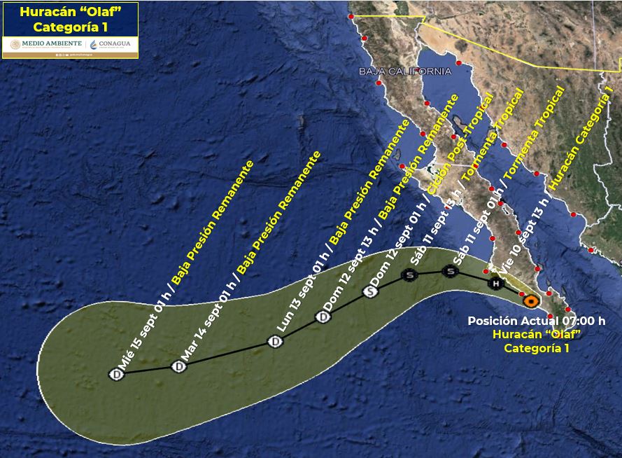 CIUDAD DE MÉXICO.- El centro del Huracán “Olaf” de categoría 1 en la escala Saffir-Simpson, se localiza en línea de costa al oeste-suroeste de Baja California Sur.