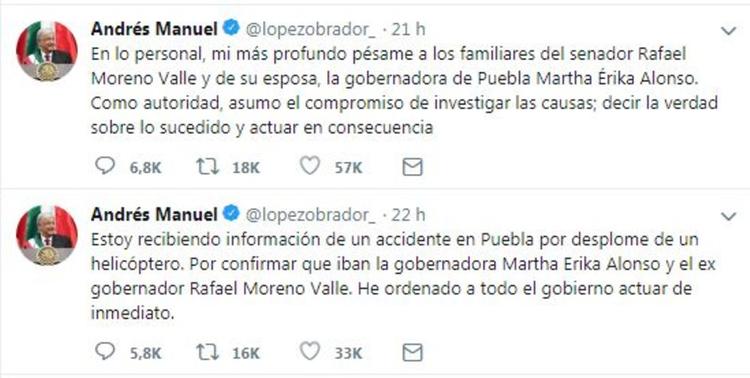 Andrés Manuel López Obrador informó a través de su cuenta de Twitter que ordenó actuar a todo el gobierno por el accidente en Puebla y, posteriormente expresó sus condolencias a los familiares del senador Rafael Moreno Valle y de su esposa, Martha Érika Alonso para después comprometerse a investigar las causas; decir la verdad de lo sucedido y actuar en consecuencia.