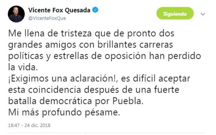 Vicente Fox Quesada fue el primero en exigir una aclaración de los hechos a través de su cuenta personal, ya que consideraba una coincidencia la muerte de ambos políticos después de la fuerte batalla democrática que se vivió en Puebla entre ellos y el partido Movimiento Regeneración Nacional (Morena).
