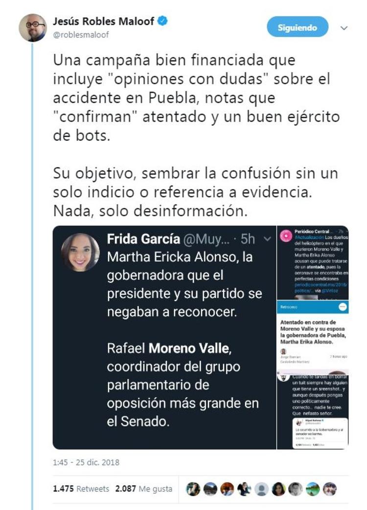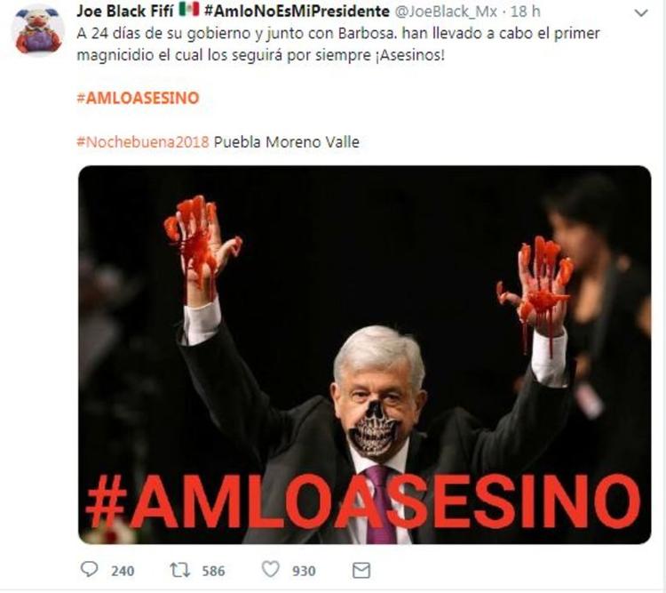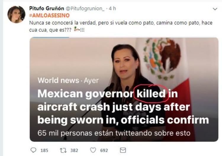 En Twitter se posicionó en tendencia nacional el #AMLOASESINO, donde destacan palabras como atentado, asesinato o venganza y en el que se le atribuye la muerte de la gobernadora de Puebla, Martha Érika Alonso y su pareja Rafael Moreno Valle al Presidente