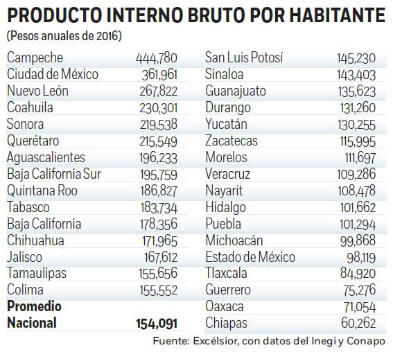 Datos del Instituto Nacional de Estadística y Geografía (Inegi) y del Consejo Nacional de Población (Conapo) señalan que entre 2003 y 2016, las entidades con mayor Producto Interno Bruto (PIB) por habitante son Ciudad de México, Nuevo León, Sonora, Querétaro y Aguascalientes, las cuales han tenido un crecimiento del indicador superior a aquellas entidades que tienen menor PIB por habitante, que son Chiapas, Oaxaca, Guerrero, Tlaxcala y el Estado