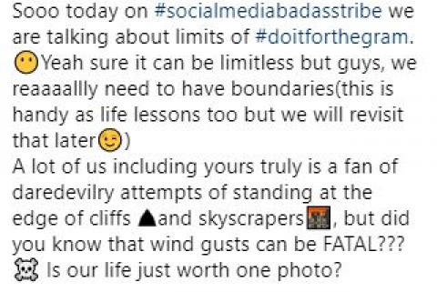 Muchos de nosotros, yo incluida, somos realmente fanáticos de los temerarios intentos de pararse al borde de los acantilados y rascacielos, pero ¿sabían que las ráfagas de viento pueden ser fatales?,”¿Vale nuestra vida una sola foto?”, se preguntó entonces. , escribió Meenakshi.