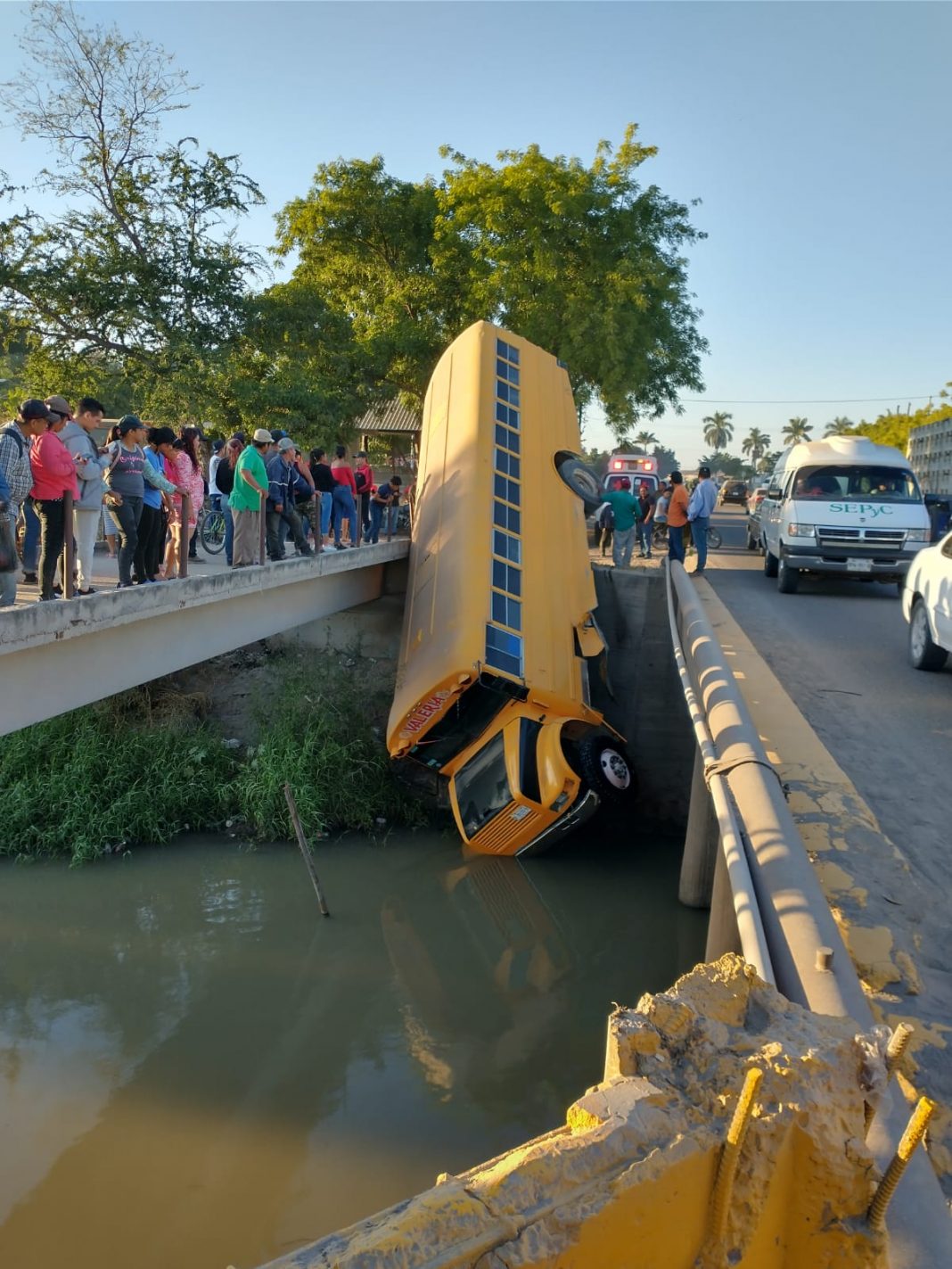 VILLA JUÁREZ, Sin.- Un presunto camión de transporte de personal agrícola que viajaba sin pasaje cayó a las inmediaciones del dren Caimanero en el acceso principal norte de la ciudad de Villa Juárez.