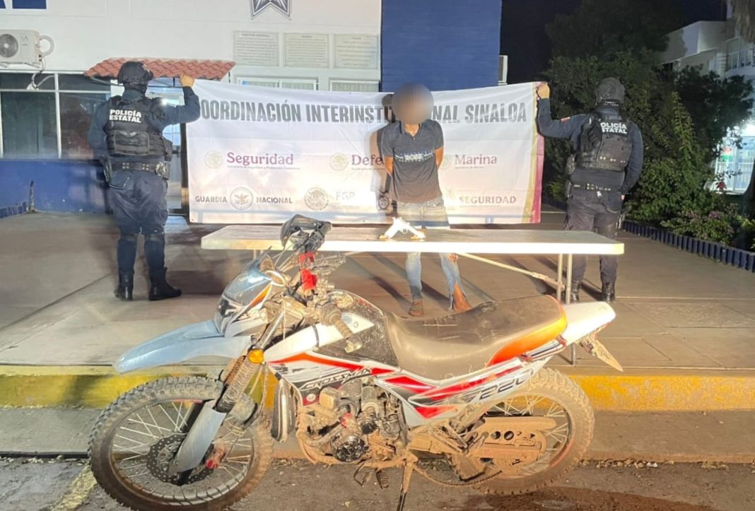 CULIACÁN, Sin.- Elementos de la Secretaría de Seguridad Pública, a través de la Policía Estatal Preventiva, en coordinación con el Ejército Mexicano, la Guardia Nacional, la Secretaría de Marina, la Secretaría de Seguridad y Protección Ciudadana, la Fiscalía General de la República y la Fiscalía General del Estado, aseguraron a un civil con un arma y en una motocicleta con reporte de robo.