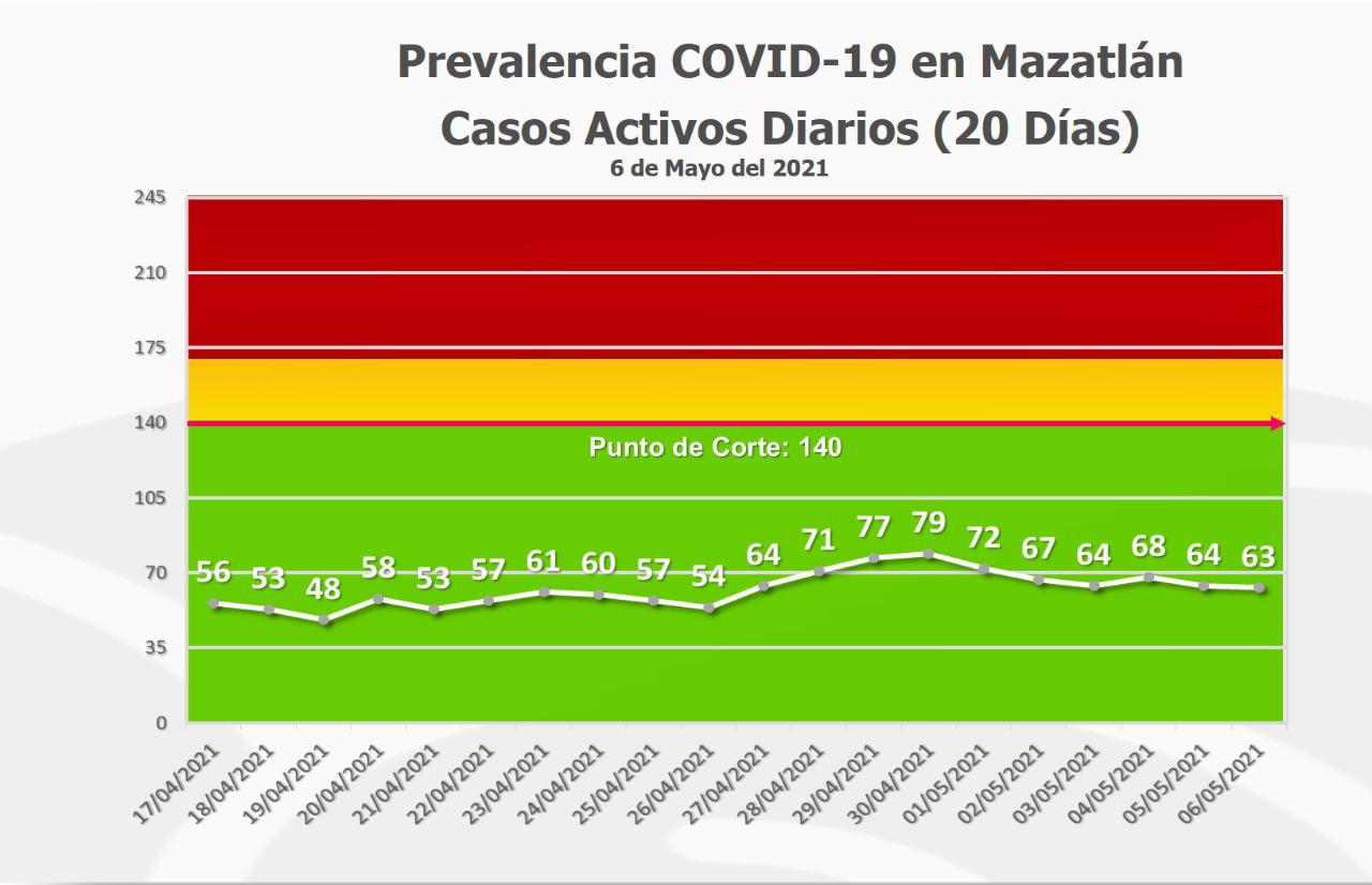 MAZATLÁN, Sin.- Un nuevo descenso registraron los casos de COVID-19 en el puerto, que este viernes amaneció con 63 pacientes del virus Sars-Cov-2, un 20 por ciento menos respecto a los últimos 5 días.