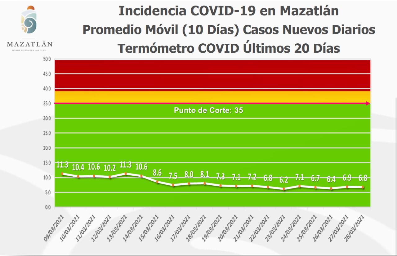 Agregó que el Termómetro del Gobierno Municipal se ubicó este día en los 6.8 grados COVID, promedio de los 10 últimos días, y se mantiene en color verde, alejado del punto de alerta que son los 35 grados.