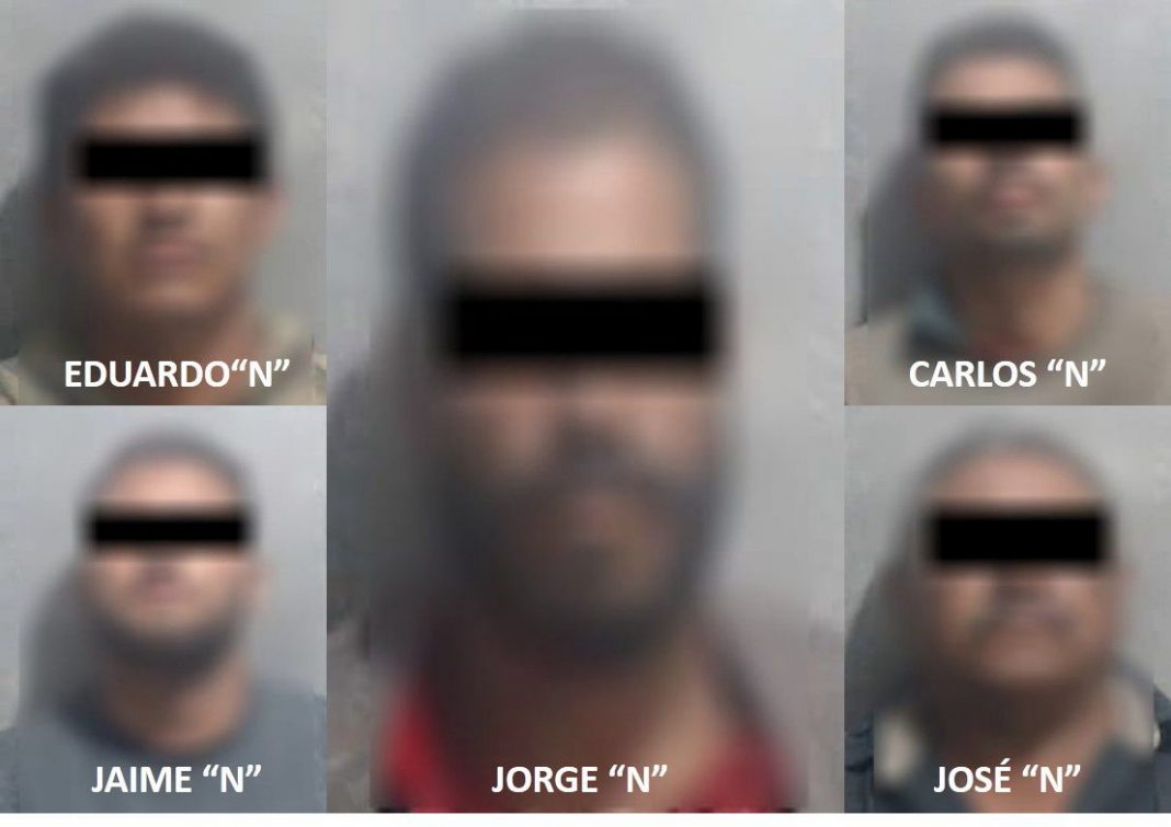 La Secretaría de Seguridad Pública y Tránsito Municipal dio a conocer que las personas aseguradas son Jaime Alexis “N”, de 27 años, José Cruz “N”, José Eduardo “N”, de 26 años, Jorge “N”, de 33 años y Carlos Espiridión “N”, de 30 años.