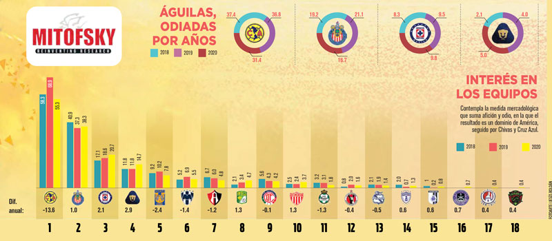 En tanto, Cruz Azul y Pumas incrementaron su preferencia en el público al registrar su porcentaje de aceptación, pasando del 9.8 al 10.9 y del 7.8 al 9.7, respectivamente. Este incremento en la predilección de la fanaticada universitaria le ayudó a volver al cuarto lugar, posición que abandonó en el 2019 al ser superado por Tigres, que este año tuvo 6.1 por ciento.