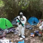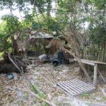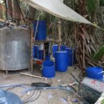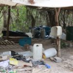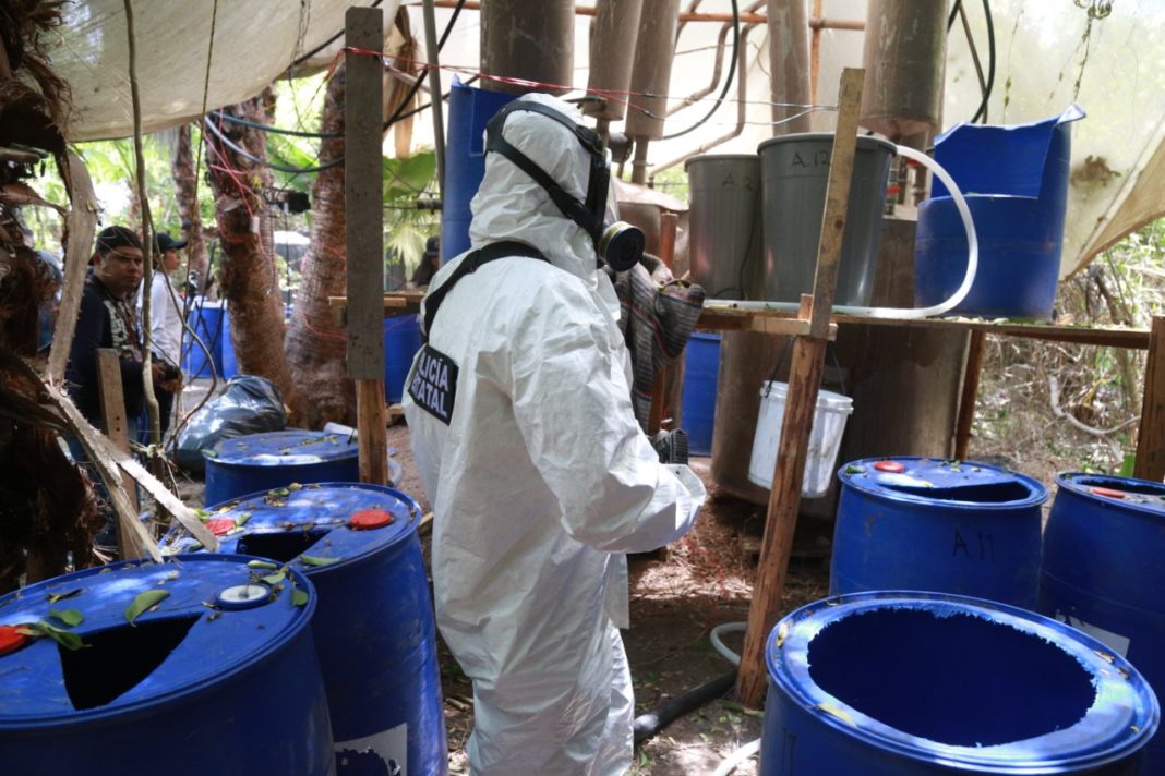El hallazgo del primer asentamiento se realizó entre palmeras y maleza, estaba camuflado con malla-sombra y ahí se encontraron reactores, varios bidones con leyendas de precursores químicos, costales con material diverso, mascarillas, guantes de látex, así como tiendas de campaña.