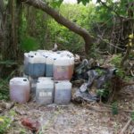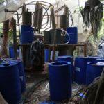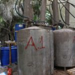 En un tercer asentamiento, en el que se concentraba mayor olor a precursores, se aseguraron más contenedores, tambos de color azul, reactores y ollas con residuos de sustancias químicas, mismo que estaba camuflado también con malla-sombra de color café, entre la naturaleza, tambos ocultos con hoja de palma, y equipamiento diverso que se ha encontrado ya en laboratorios para la elaboración de metanfetamina.