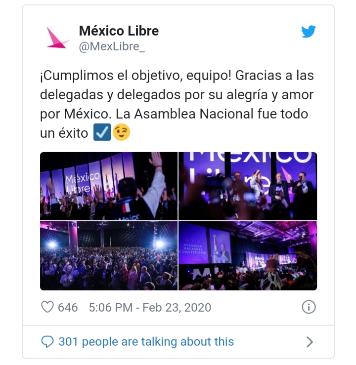 Hasta el momento, México Libre registra 279,961 afiliados, 200 asambleas distritales y celebró este domingo su asamblea nacional constitutiva, requisito para poder aspirar a ser partido político.