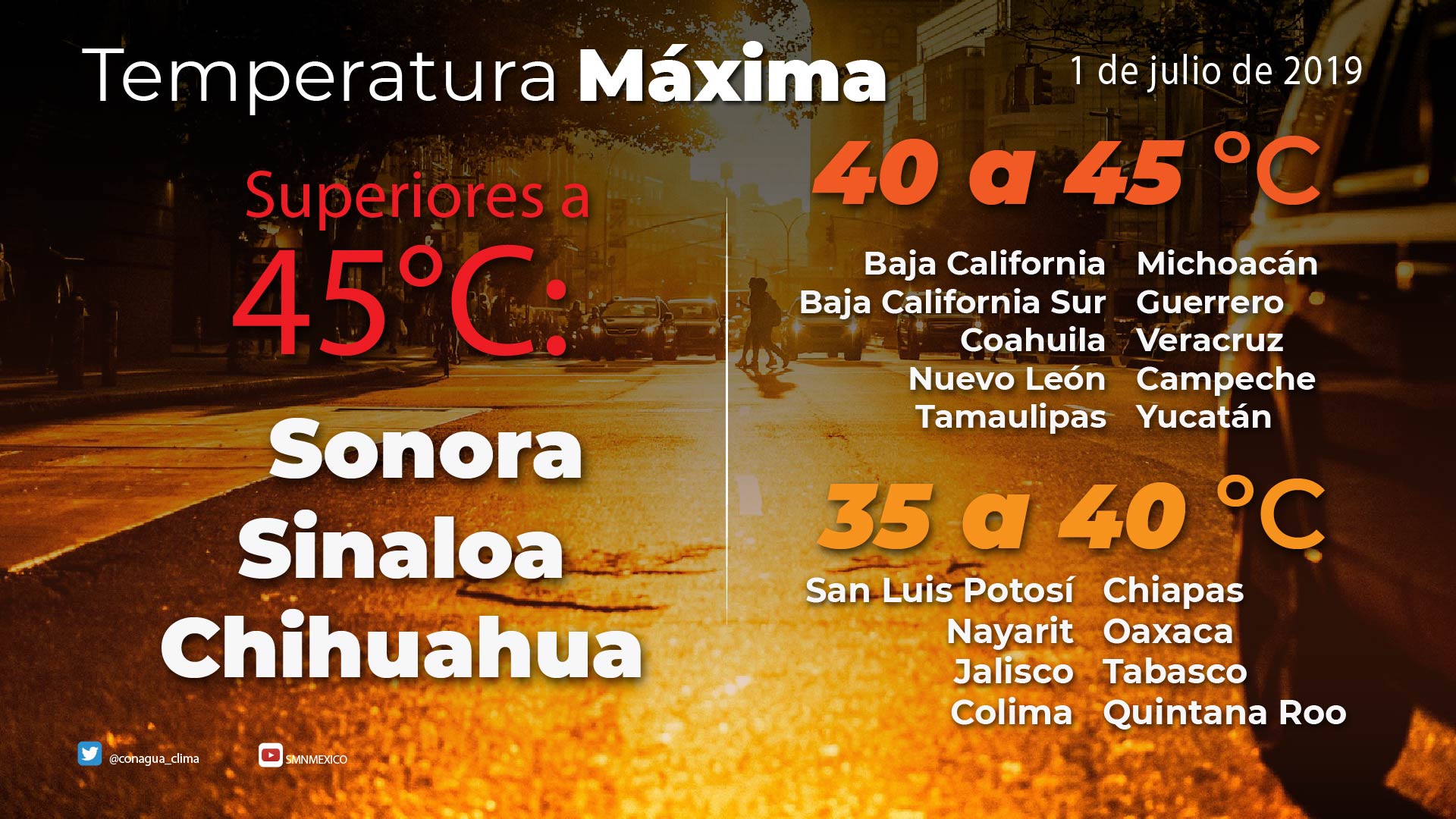 CIUDAD DE MÉXICO.- Temperaturas superiores a 45 grados centígrados se estiman para hoy en regiones de Sonora, Sinaloa y Chihuahua.