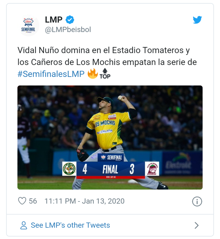 El refuerzo Vidal Nuño realizó una apertura de calidad y mantuvo a raya a la ofensiva guinda. Por su parte los bates verdes le propinaron su primera derrota a Anthony Vásquez quien antes de este juego tenía marca de 8-0 en juegos de postemporada con los Tomateros en LMP.