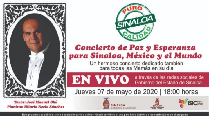 CULIACÁN, Sin.- El gobierno del estado de Sinaloa, a través del Instituto Sinaloense de Cultura, invita a la ciudadanía a estar pendientes del “Concierto de Paz y Esperanza para Sinaloa, México y el Mundo”, que se transmitirá en vivo a través de las redes sociales de gobierno estatal, este jueves 07 de mayo las 18:00 horas.