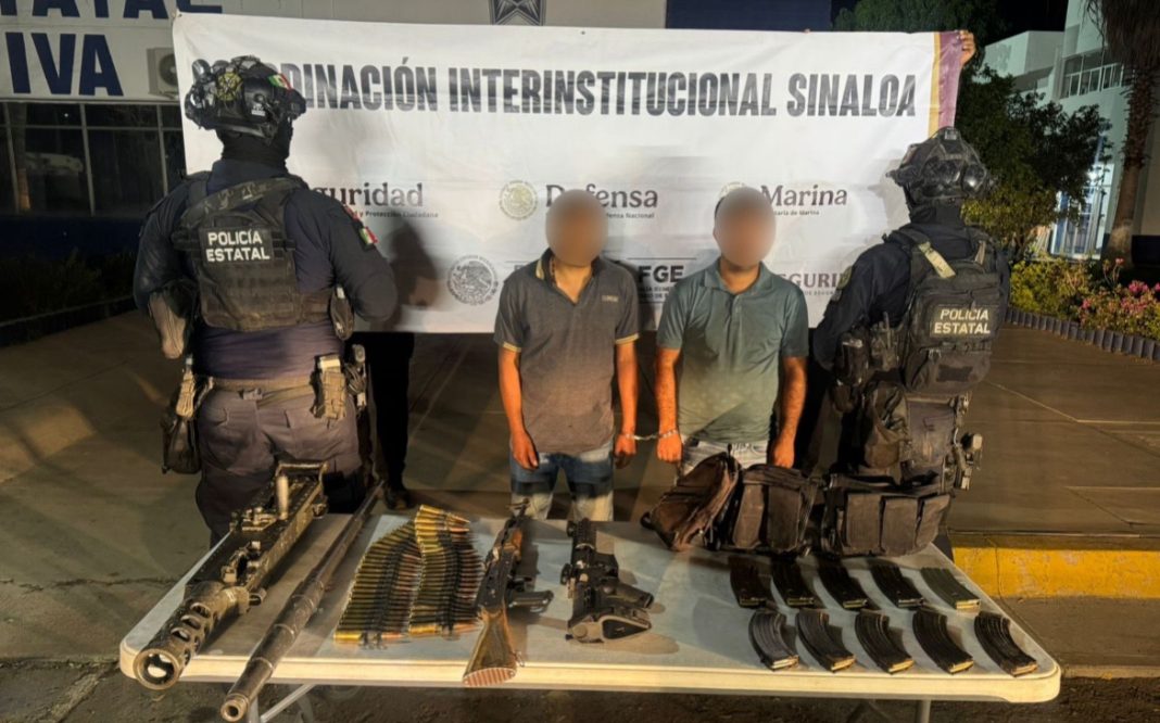 CULIACÁN, Sin.- Elementos de la Secretaría de Seguridad Pública del Estado, a través del Grupo de Operaciones Especiales de Sinaloa (GOES), de la Policía Estatal Preventiva, en coordinación con el Ejército Mexicano, la Guardia Nacional, la Secretaría de Marina, la Secretaría de Seguridad y Protección Ciudadana, la Fiscalía General de la República y la Fiscalía General del Estado, detuvieron a dos civiles y aseguraron armas largas, municiones y chalecos tácticos, en el municipio de Navolato.