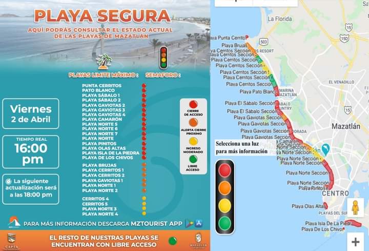 MAZATLÁN, Sin.- De las 27 áreas de playa de Mazatlán, 17 se encuentran cerradas al público debido a la saturación, 6 en alerta de cierre y 4 aún con acceso permitido.