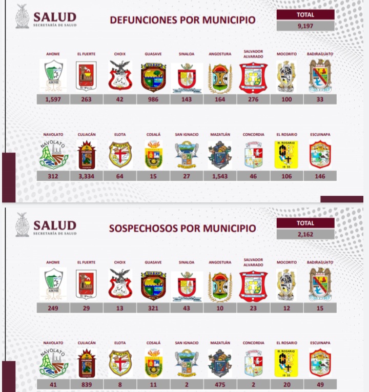 Excluida información de clínicas y hospitales privados en el caso de contagios, los sospechosos sumaron 2,162 de los cuales Culiacán acumuló 839, seguido de Mazatlán con 475 y Ahome con 249.