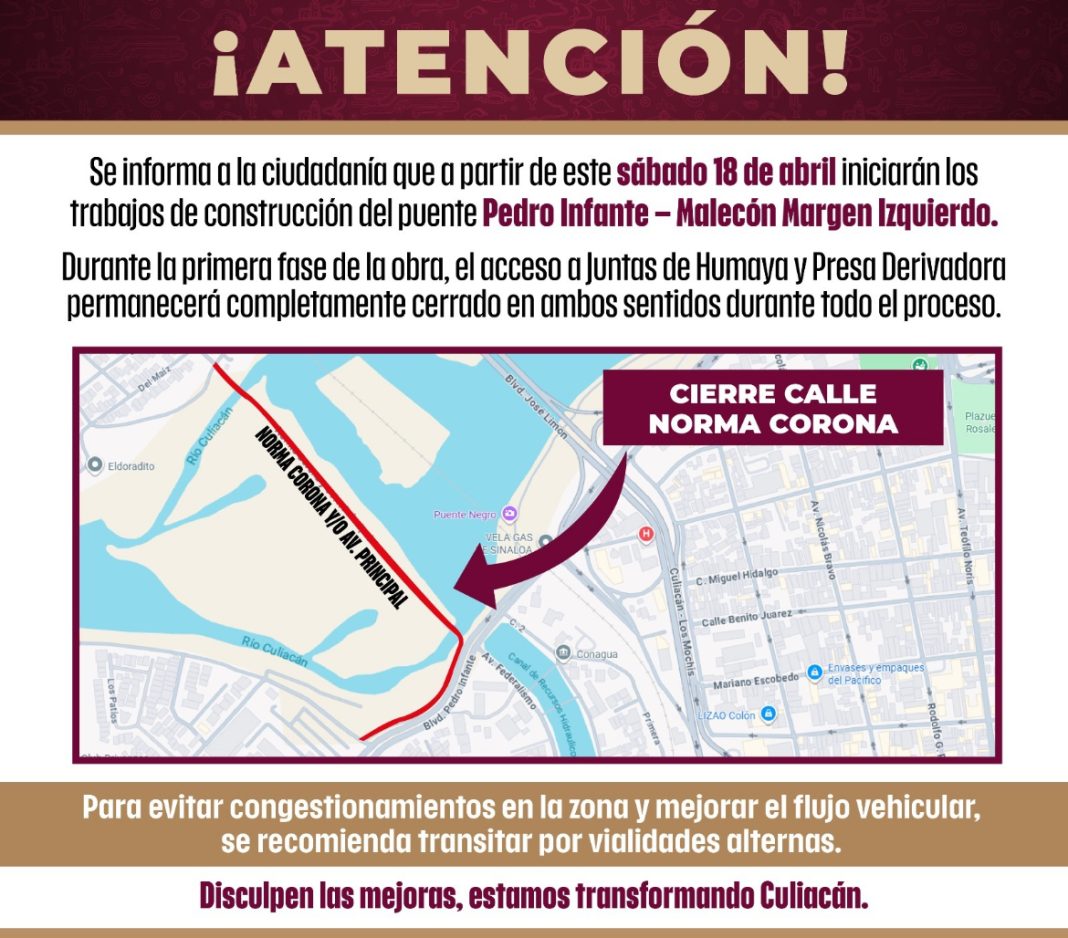 CULIACÁN, Sin.- El Ayuntamiento de Culiacán informó a la ciudadanía que a partir de este sábado 18 de abril iniciarán los trabajos de construcción del puente Pedro Infante – Malecón Margen Izquierdo.