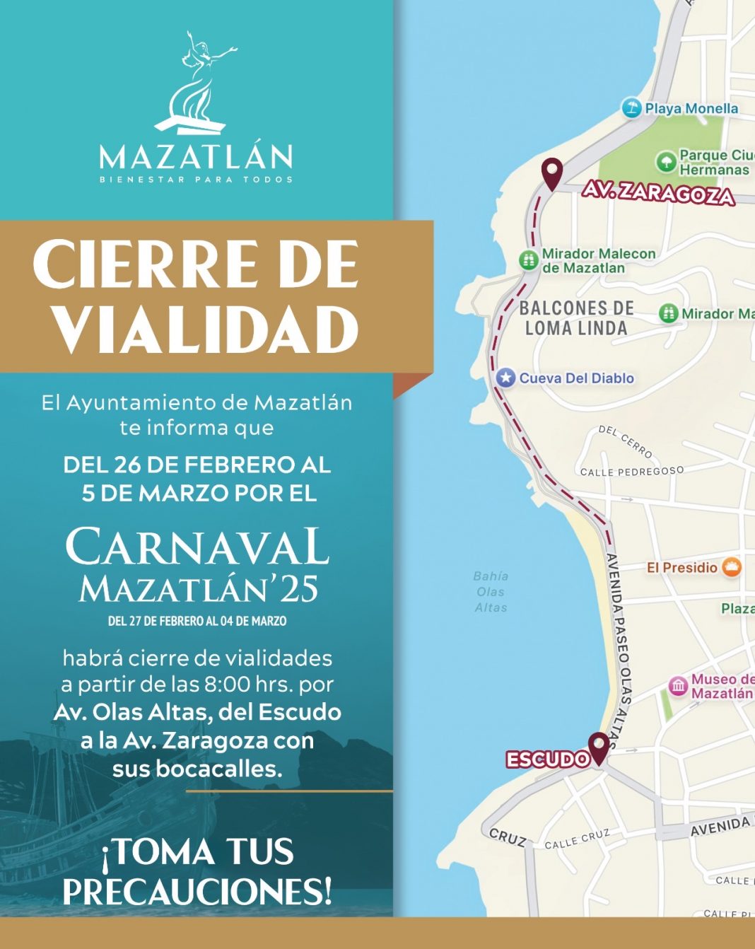 MAZATLÁN, Sin.– Debido a la realización de las fiestas del Carnaval Internacional de Mazatlán 2025, “La Perla”, la Secretaría de Seguridad Pública Municipal, a través de la Subdirección de Tránsito, informa sobre cierres viales desde la avenida Ignacio Zaragoza hasta las calles Carranza y Lewis, a un costado del Escudo de Sinaloa, a partir de mañana miércoles 26 de febrero, en punto de las 08:00 horas.