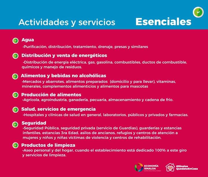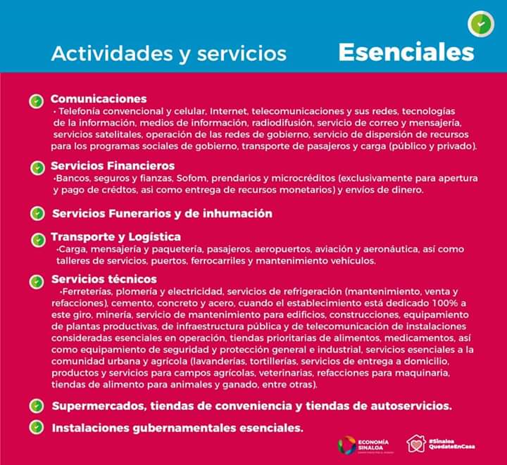 CULIACÁN, Sin.- Conoce las actividades y servicios que continúan con sus labores, por ser esenciales para atender la emergencia sanitaria por el COVID-19.