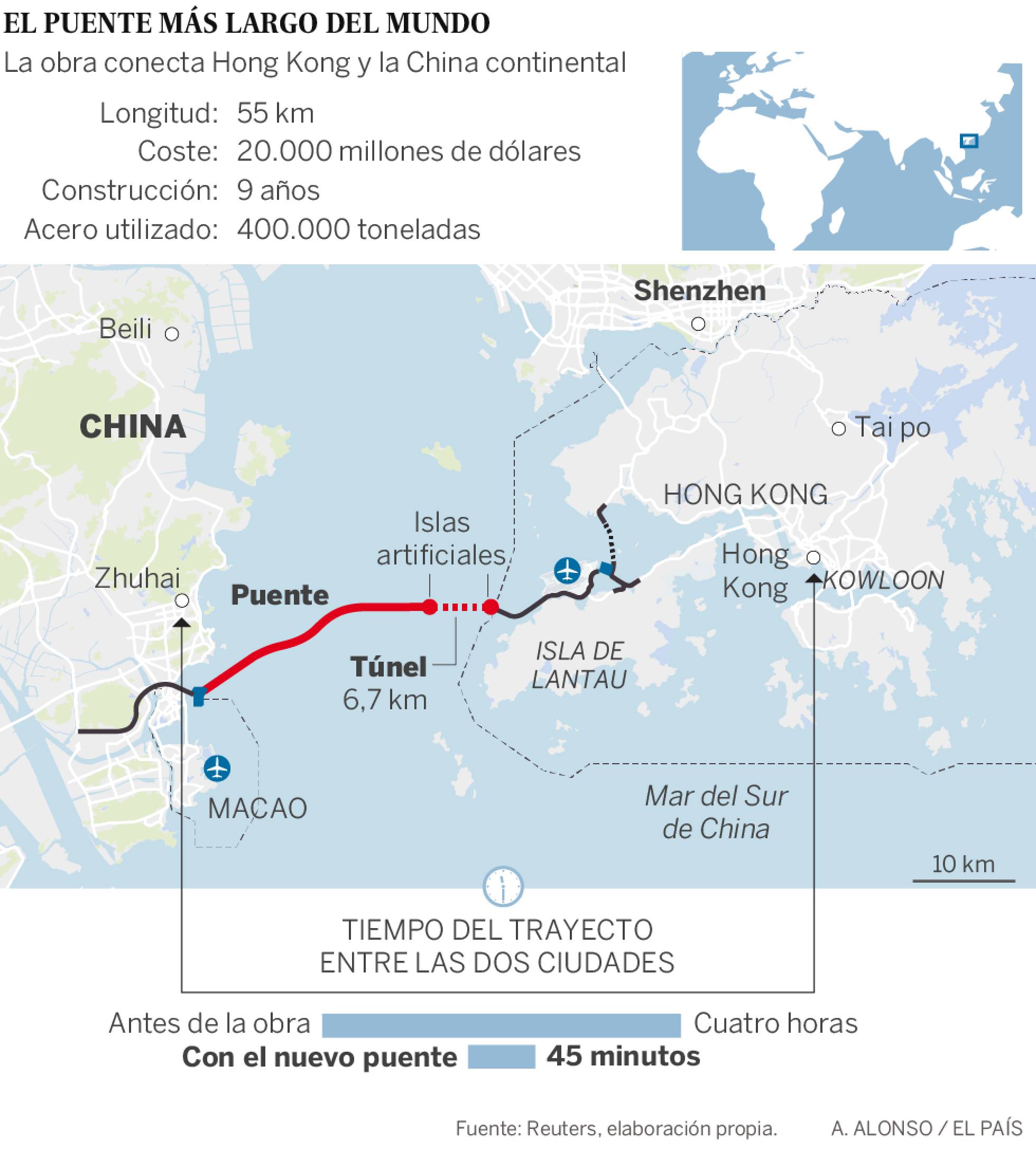 MADRID, España.- Con una corta frase —“anuncio oficialmente la apertura del puente Hong Kong-Zhuhai-Macao”—, el presidente chino, Xi Jinping, ha inaugurado este martes el puente más largo del mundo sobre el mar. La colosal obra mide 55 kilómetros, ha costado cerca de 20 mil millones de dólares y su construcción durante nueve años ha estado plagada de problemas, retrasos y tensiones políticas.