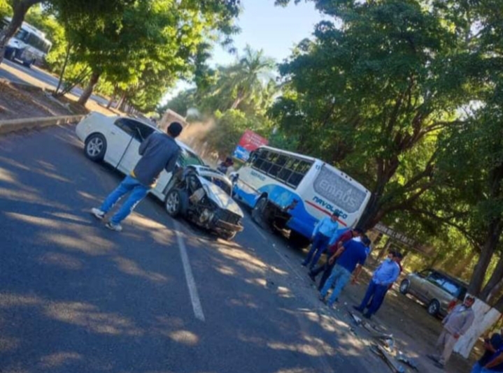 El aparatoso accidente registrado en el carril de poniente a oriente se presume se dio por alcance entre un vehículo sedán y un camión de pasajeros.