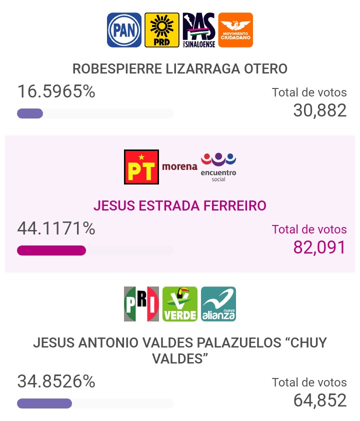 NAVOLATO, Sin.- De acuerdo al Programa de Resultados Preliminares el alcalde con licencia Jesús Antonio Valdés Palazuelos “Chuy Valdés” perdería Culiacán con un margen de 10% frente al candidato de Morena, Jesús Estrada Ferreiro.