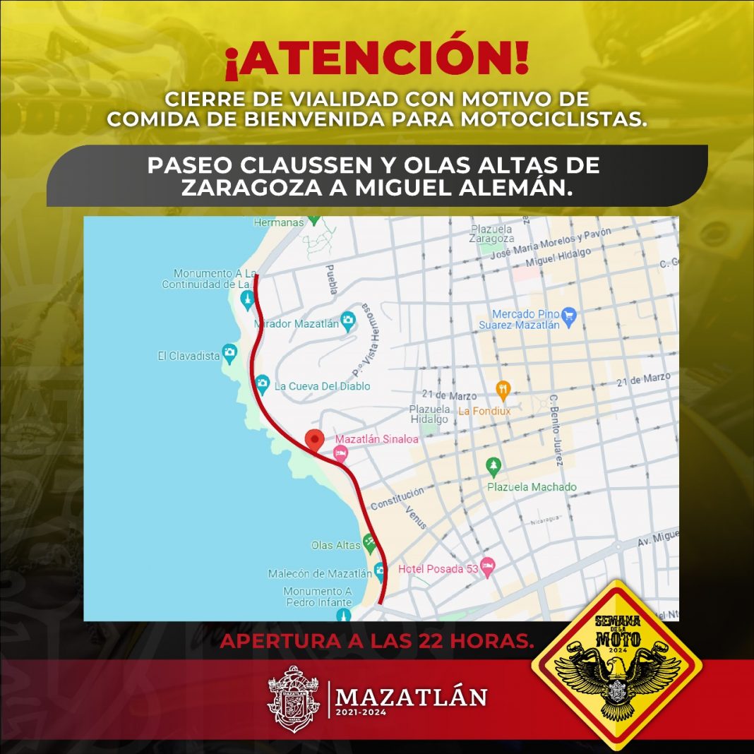MAZATLÁN, Sin.- Debido a la tradicional reunión y comida de bienvenida que organizan los integrantes del Motoclub Olas Altas para los participantes de los diferentes Motoclubes que acuden a Mazatlán durante la semana de la moto, la Secretaría de Seguridad Pública y Tránsito Municipal informa sobre el cierre de circulación en la zona de Olas Altas desde Avenida Zaragoza hasta el Escudo de Sinaloa durante este día viernes.