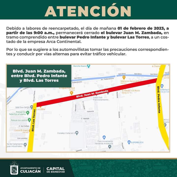 CULIACÁN, Sin.- Debido a labores de reencarpetado el día 01 de febrero a partir de las 09:00 horas permanecerá cerrado el bulevar Juan M. Zambada, por lo que sugerimos tomar precauciones y tomar vías alternas.