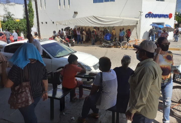 NAVOLATO, Sin.- Con un calor superior a los 30 grados centígrados, parados y algunos hasta en el sol, más de 200 adultos mayores cobran su pensión sin la distancia adecuada marcada a raíz de la pandemia por coronavirus.