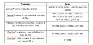 - Evitar la adquisición y uso de los productos Vitacilina® y Derman® con los números de lote arriba listados.