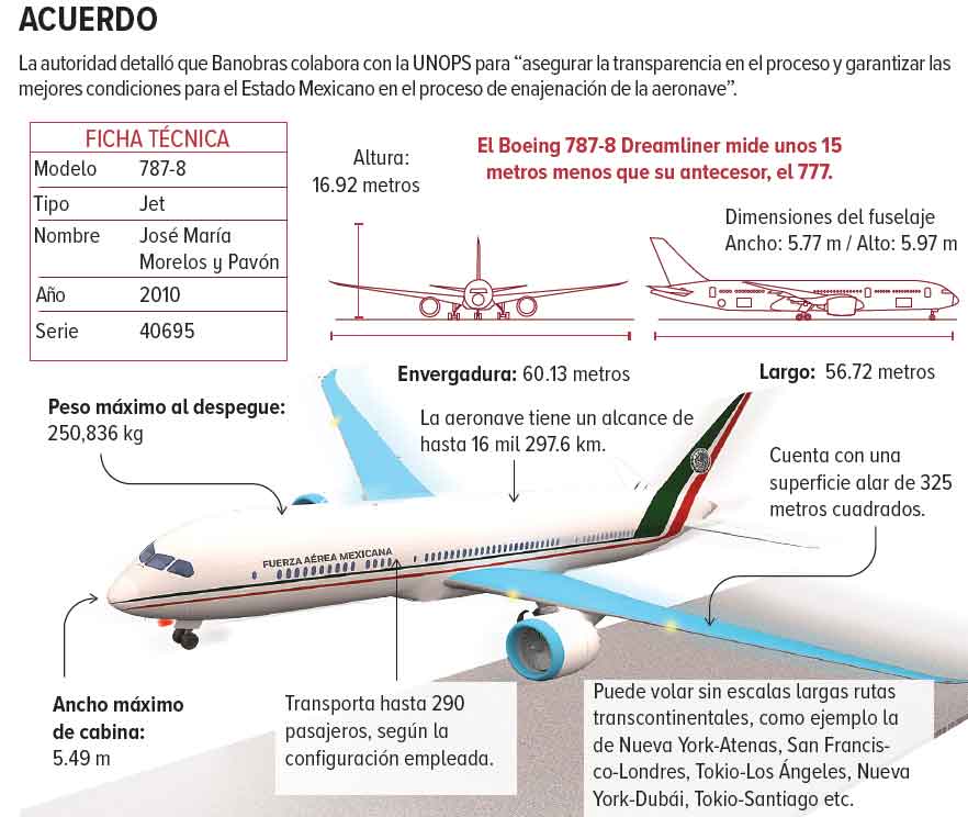 CIUDAD DE MÉXICO.- La Secretaría de Hacienda informó que inició el proceso formal para la enajenación del avión presidencial José María Morelos y Pavón, por lo que la Oficina de las Naciones Unidas de Servicios para Proyectos (UNOPS, por sus siglas en inglés) publicó la solicitud de expresión de interés dirigida a potenciales compradores.