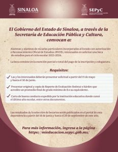 CULIACÁN, Sin.- La Secretaría de Educación Pública y Cultura (SEPyC), a través del Sistema Estatal de Becas de Sinaloa (BECASIN), abrió este lunes la convocatoria dirigida a alumnas y alumnos de escuelas particulares incorporadas al Estado con Autorización o Reconocimiento de Validez Oficial de Estudios para el Ciclo Escolar 2023-2024, a que presenten su solicitud ante la institución educativa. El plazo es hasta el 30 de junio de 2023.