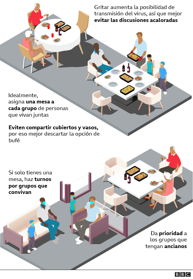 Recomiendan que los padres coman primero, mientras el resto espera alejado y con mascarilla.