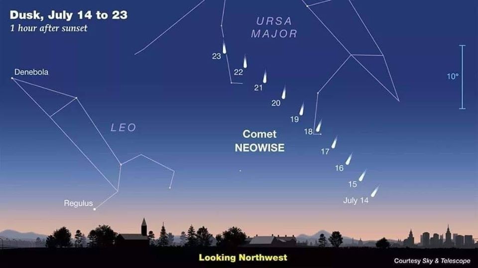 El ascenso será rápidamente. Del 19 al 23 el cometa avanzará casi diez grados. Conforme pasen los días cada vez se integrará más la constelación de la Osa Mayor. El primer día que el cometa podrá ubicarse “dentro” de la constelación será el 18 de julio.