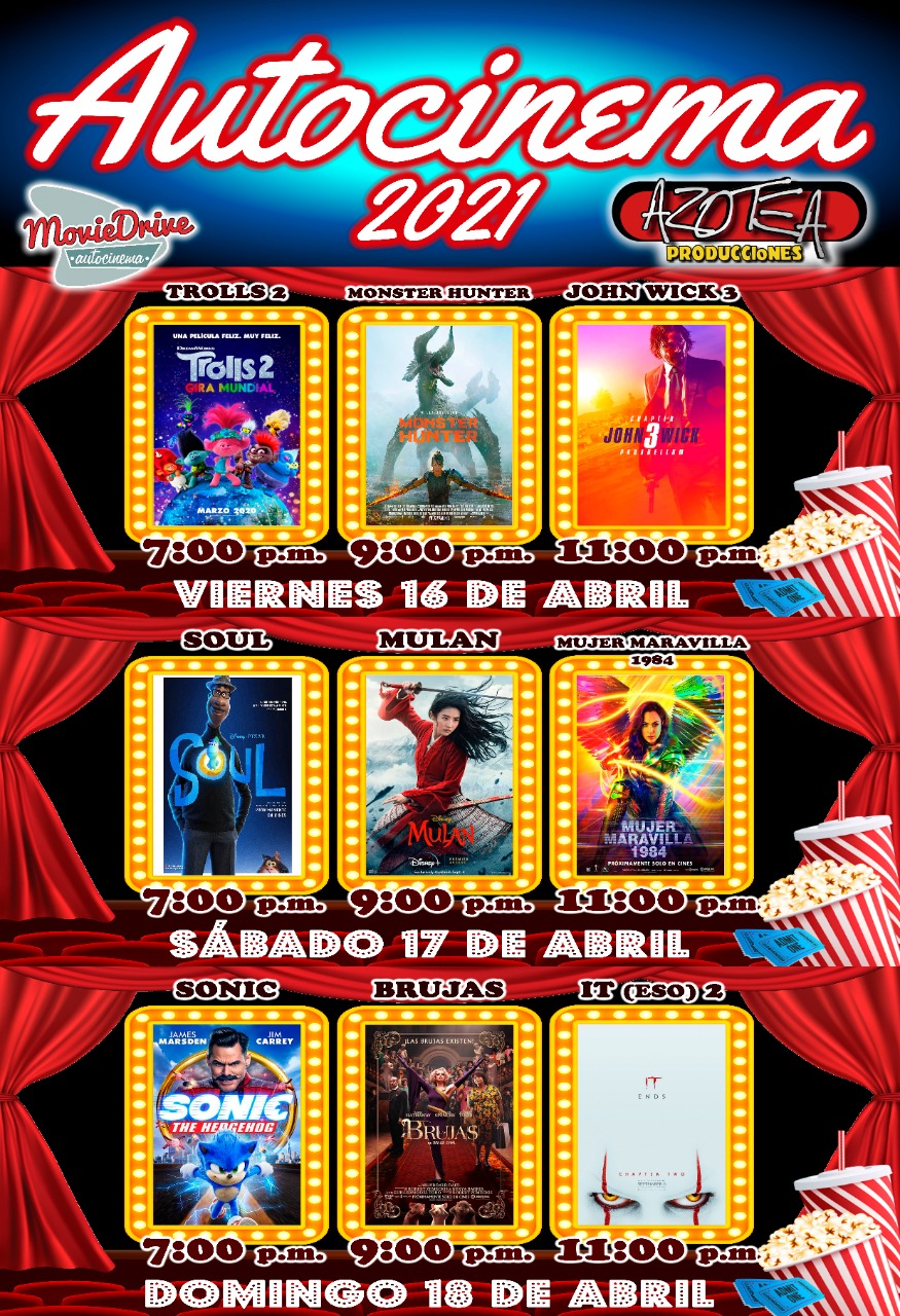 El evento consta de la instalacion de una pantalla gigante de 12 x 8 metros en la cual las personas irán en su auto y escucharán la película por medio de la radio de su auto.